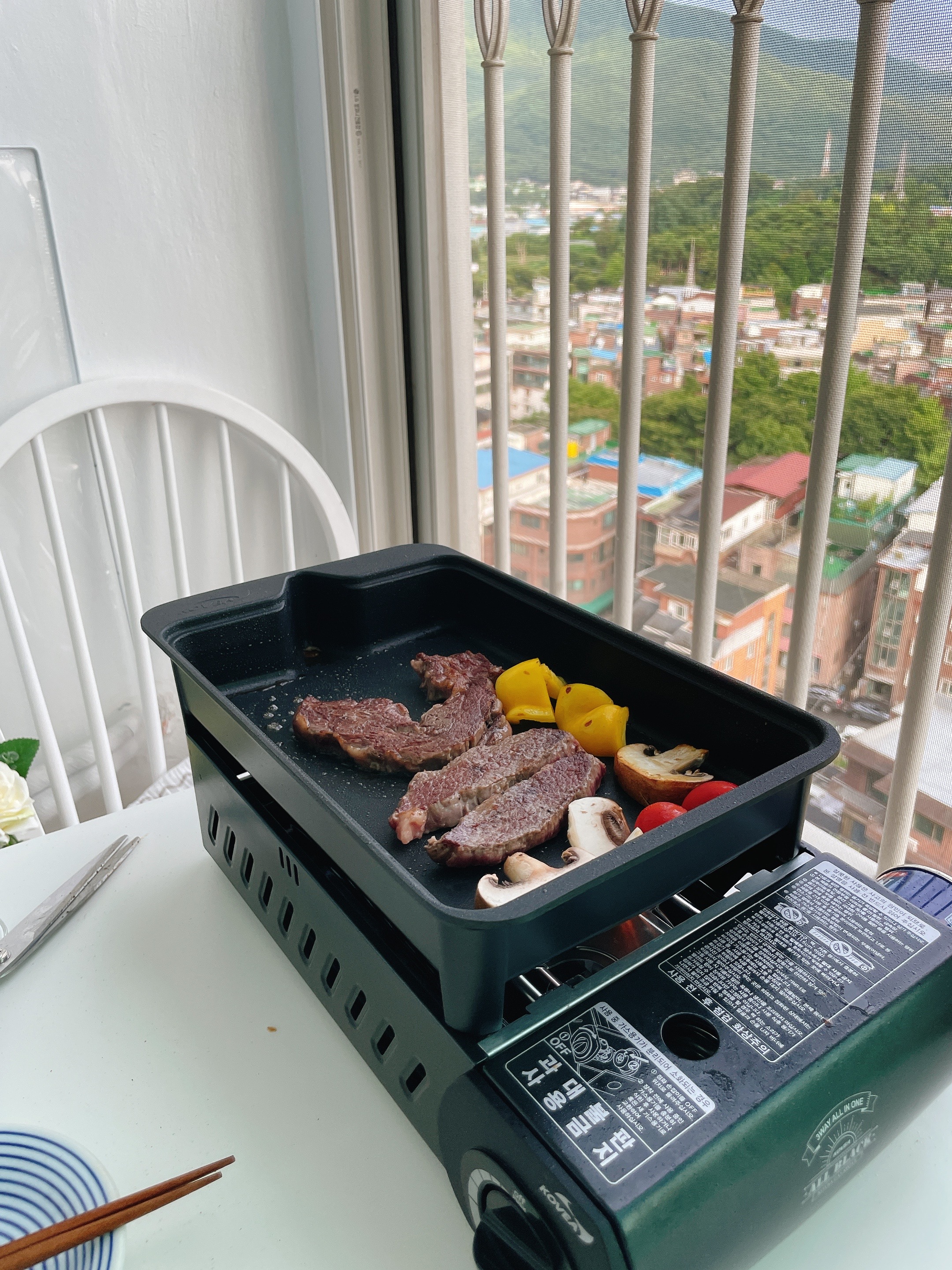베란다에서 캠핑 기분 내며 고기를 구워먹어 보았습니다.
