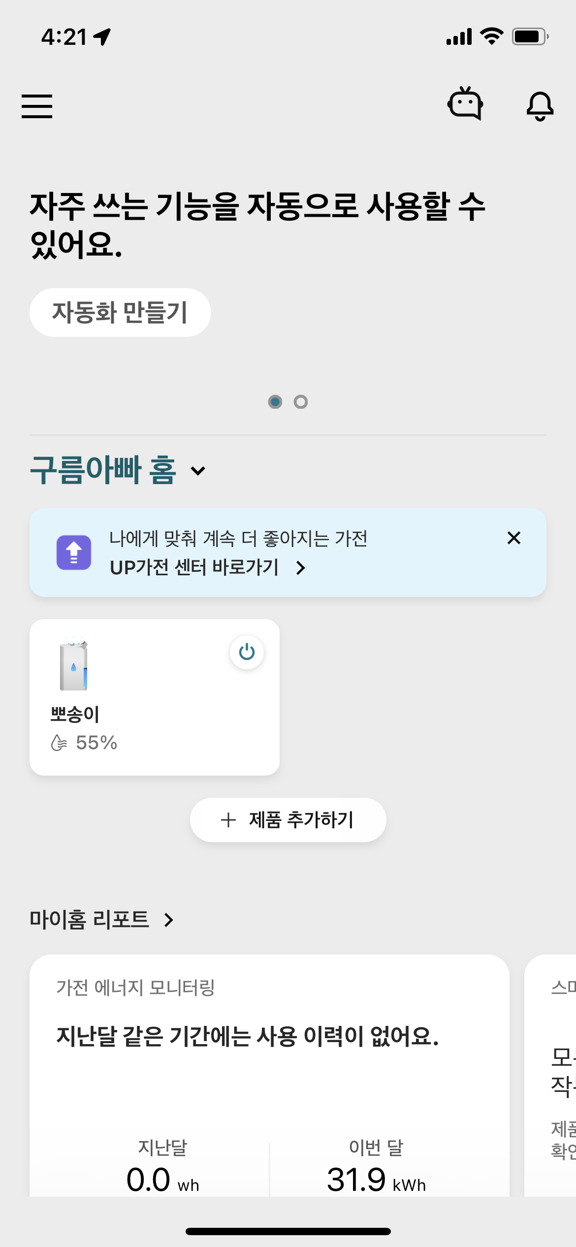 기존에 구매했던 엘지 제습기는 앱 연동이 안되어 아쉬웠는데, 드디어 구름이네 집에도 엘지 씽큐앱을 사용하게 되었어요.