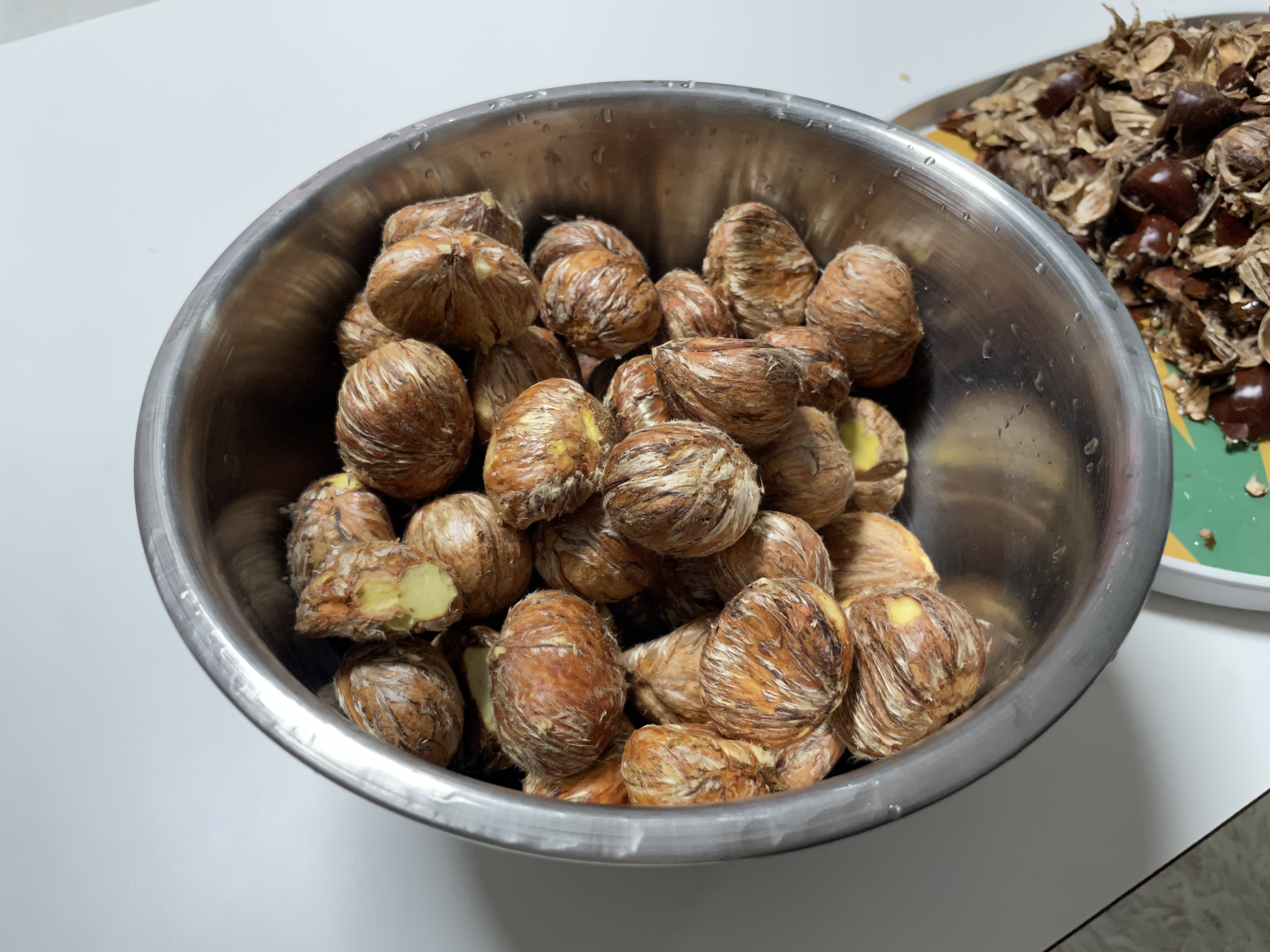 미끄러져서 손바닥에 살짝 스크래치를 내고는 놀래서 칼집 내기를 중단하고 밤가위를 꺼내와서 그냥 깠습니다.