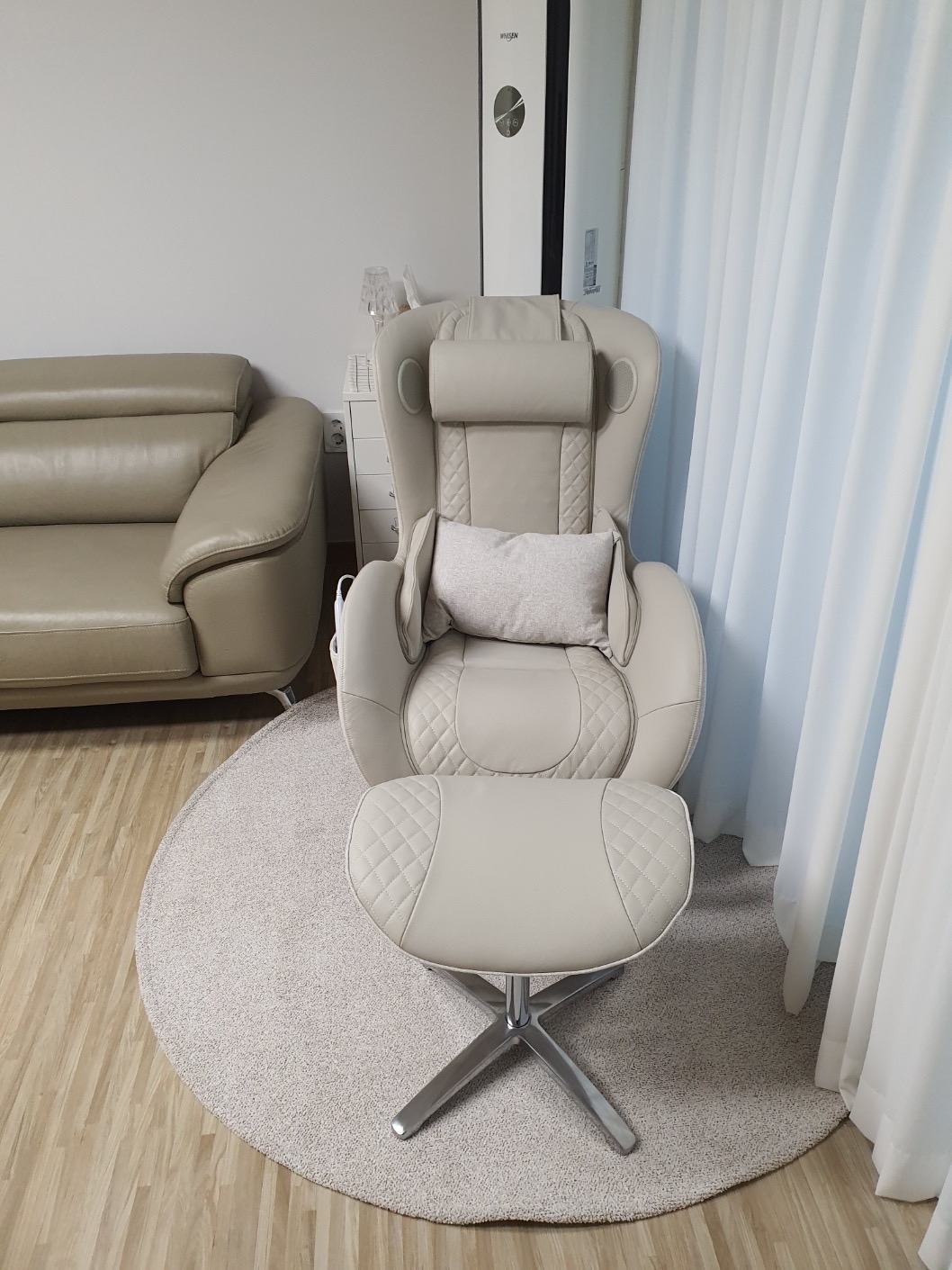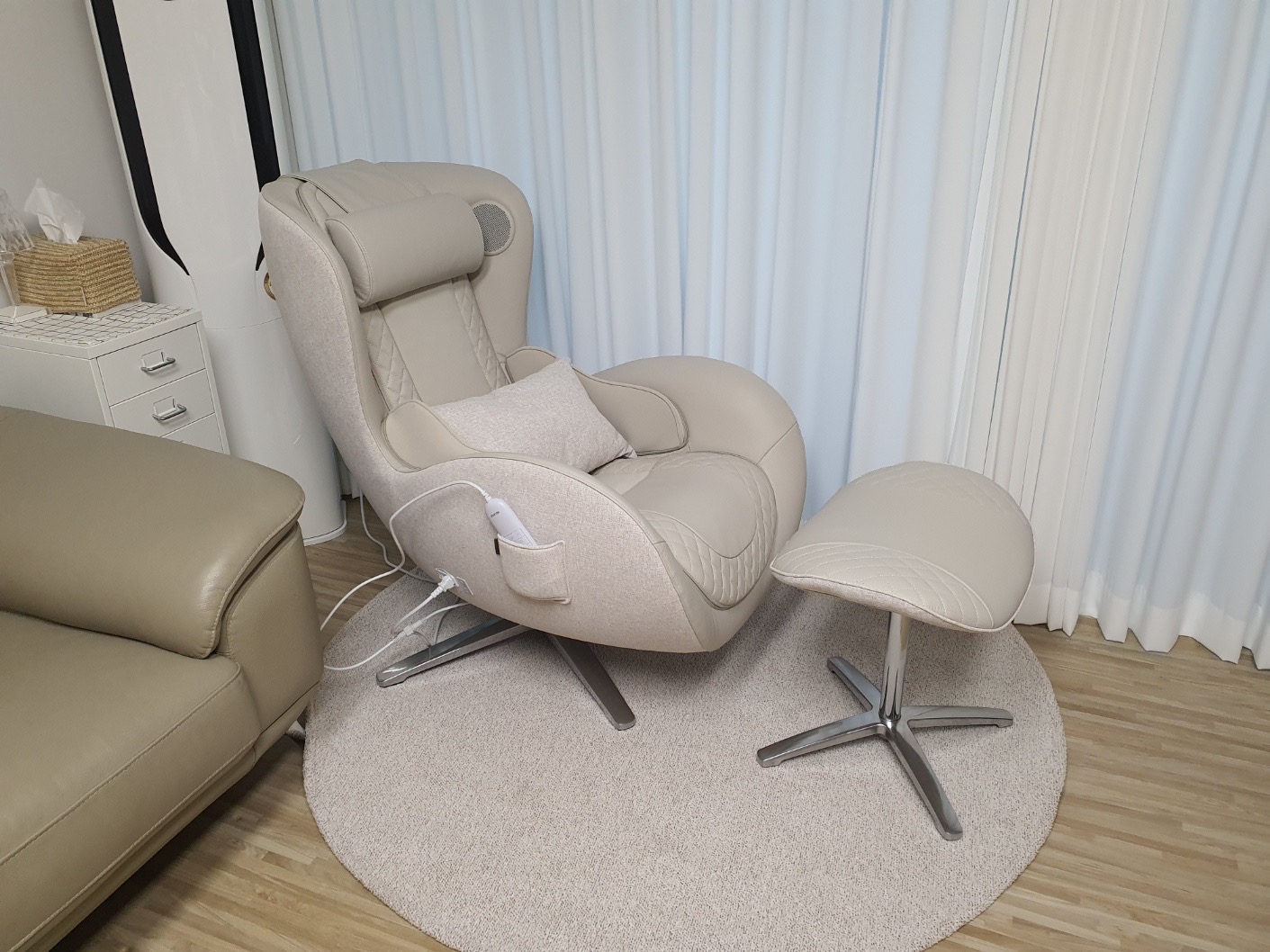 동생네집이 전반적으로 화이트 톤의 인테리어를 해두었는데, 집 거실에 너무 큰 안마기를 두고싶진 않았다고 해요.